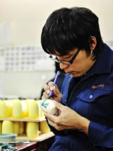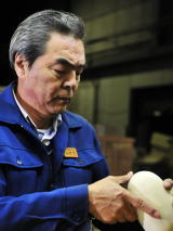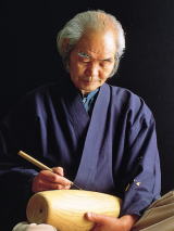 | 「卯三郎こけし」について・・・ 匠のこころで完成度を求めた、創業者岡本卯三郎。 卯三郎こけしの創業者岡本卯三郎は、大正6年榛東村に生まれ、昭和25年よりこけし創りを手がけました。ろくろ技術の製法に加えて、特殊機械の技法を取り入れ、筆による絵付けに彫刻や焼き絵を融合させるなど、新たな作風を開拓。立体感を表現できる焼き絵は卯三郎考案の新技法です。またケヤキやクリの美しい木目に魅せられ、こけしの新素材として注目。加工法の研究にも熱心に取り組みました。そして昭和54年、現在地に近代化も導入した工房を新設。手づくり工程と組み合わせて量産化にも対応できる体制を整え、全国販路と海外からの需要にお応えできるようになりました。原木を乾燥させ製材からの一貫体制で、ろくろ挽きから磨き、絵付、塗装、組立まで10段階の工程を経て、月産1万5000個の生産能力を有しています。現在、デザインを担当するのは6人の作家。初代卯三郎の薫陶を受け、匠の技の伝承にこころ燃やしています。 |